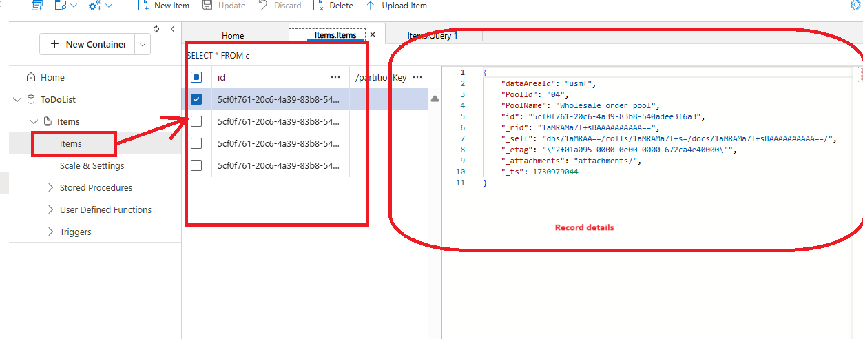 It's showing the records in JSON format. Alternately you can directly see all the records, by clicking on items themselves:Querying a CosmosDb
